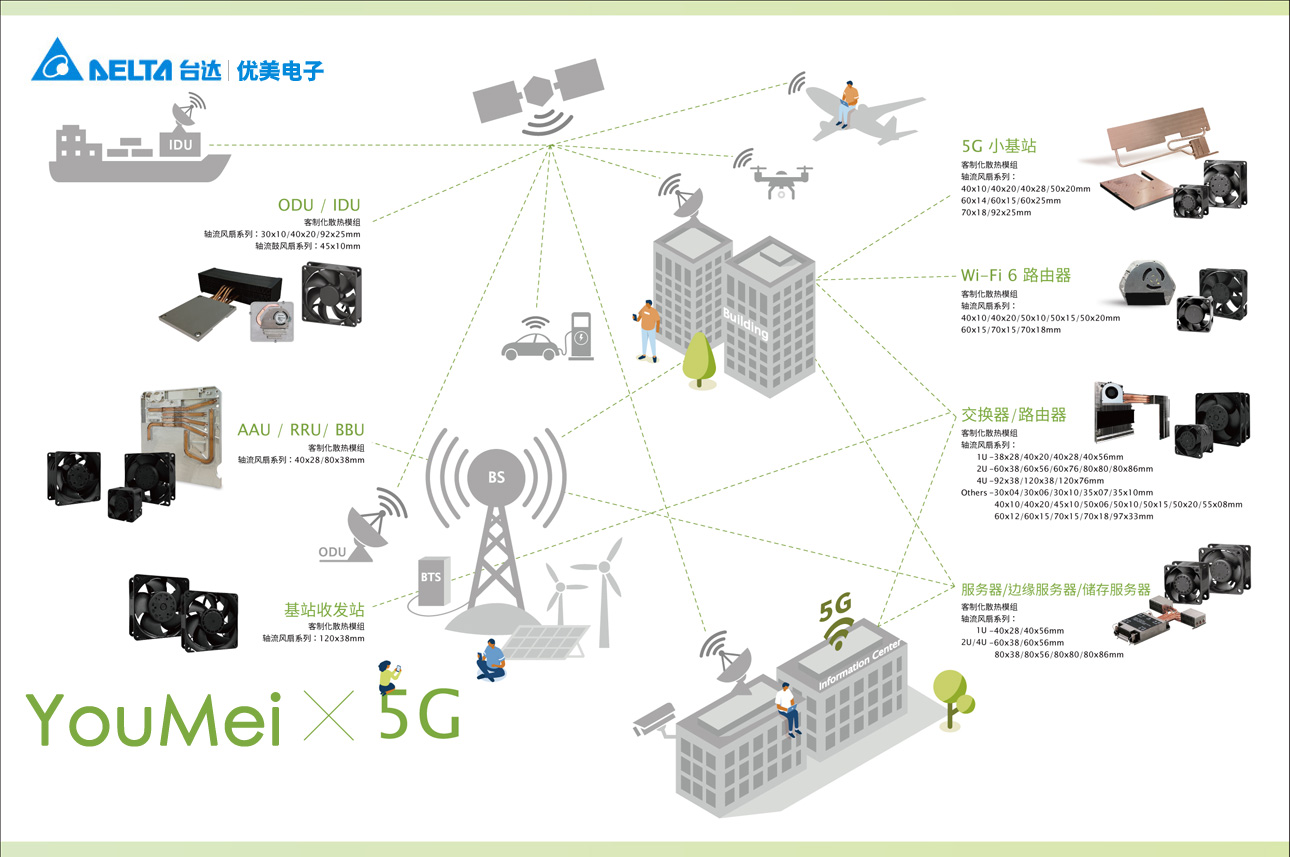 優美的全方位散熱解決方案與技術服務,可提供適用于5G基站、聯網設備、低軌衛星地面接收站等相關設備系統的優質散熱解決方案,又CMSEM一條龍的方案設計服務,能為5G前終端的設備系統打造客制化散熱模塊,不管是主動式散熱、被動式散熱、水冷散熱模塊,均可靈活配置各種散熱組件,以提供體積小、高效的散熱方案。建準的無往不勝客制化服務流程和全方位散熱解決方案,與客戶共同營造智慧城市、萬物相連的巨量數據傳輸無延遲,提升通訊效率,邁向萬物互聯新未來世界。