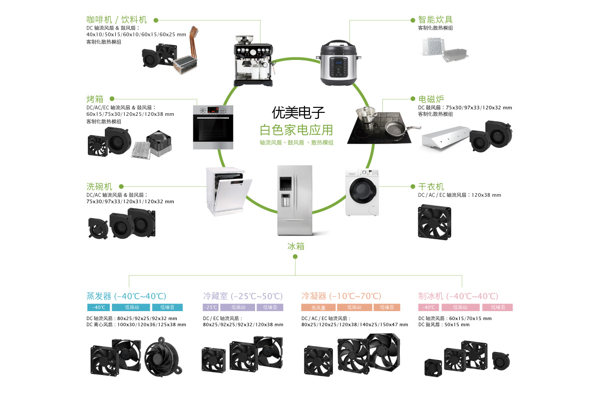 我們的日常生活充滿著各式各樣的家電產品,由于與人類的活動非常接近,因此應用于家電產品的風扇對聲音質量的要求非常高,優美極靜音系列風扇導入聲音質量優化工程,將風扇聲音質量由「傳統聲學」進化至「心理聲學」分析,為產品創造出悅耳的聲音,該系列風扇主要被應用于白色家電和黑色家電終端產品,即使跟產品近距離接觸也不會被干擾,只給消費者舒適的享受!!